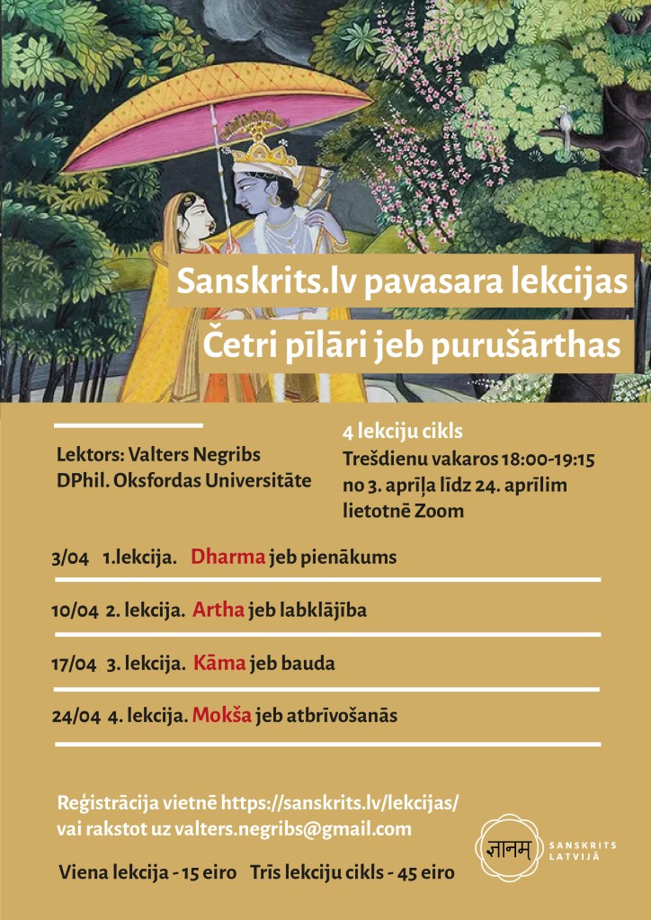 Klasiskajā hinduismā pazīstami četri pīlāri, kas nodrošina labu un piepildītu cilvēka dzīvi. Tie ir dharma jeb pienākums, artha jeb labklājība, kāma jeb bauda un mokša jeb atbrīvošanās. Šie pīlāri aprakstīti sistemātiskos apcerējumos, ar kuriem tiks iepazīstināti lekciju cikla klausītāji. Nodarbību ciklā tiek aplūkoti tādi senindiešu teksti kā Manu Dharmašāstra, Kautiljas Arthašāstra, Vātsjājanas Kāmasūtra, Mahābhārata, Bhagavadgīta un Jogas sūtras.